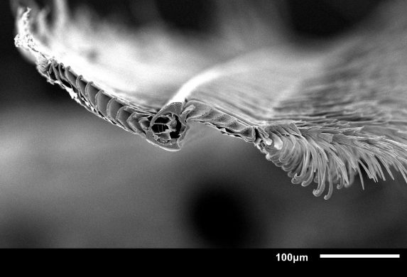 Gibson also shows how barn owl feathers enable stealthy flight. Comb-like serrations on the wing break up airflow and reduce noise.