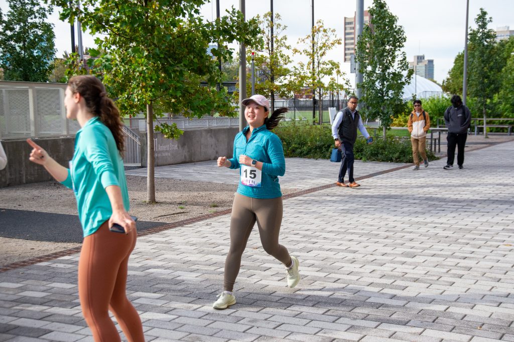 “My favorite part of the run was when a group of us got confused about the route, so we cut through the lawn in front of Tang Hall,” Dong said. At the finish line, she showed off a red DMSE hat—one of the giveaways laid out alongside ripe bananas and bottles of water.