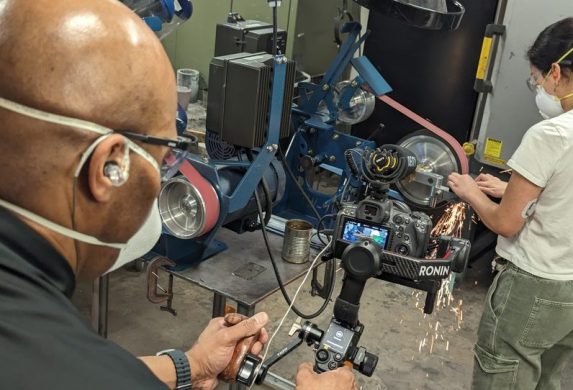 Filming in the forge — the Merton C. Flemings Materials Processing Laboratory — is not an experience the MIT Video Productions team will be quick to forget, either. Richardson, field production videographer at MIT Video Productions, held the camera just six feet away from red-hot blades being dipped into tubs of oil, creating minor fireballs and plumes of smoke.